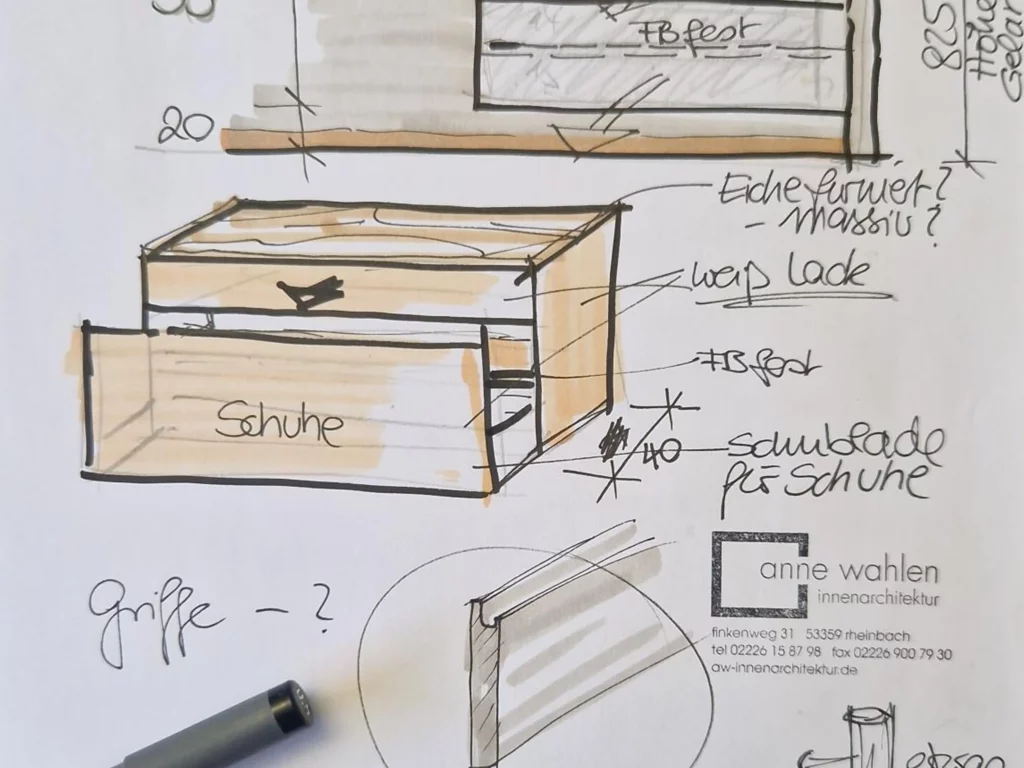 Wir erarbeiten erste Varianten zu den Themen Grundrissaufteilung, Möblierung, Materialien, Farbe und Licht zu den für Sie relevanten Bereichen. Sie erhalten erste Skizzen und Skribble.