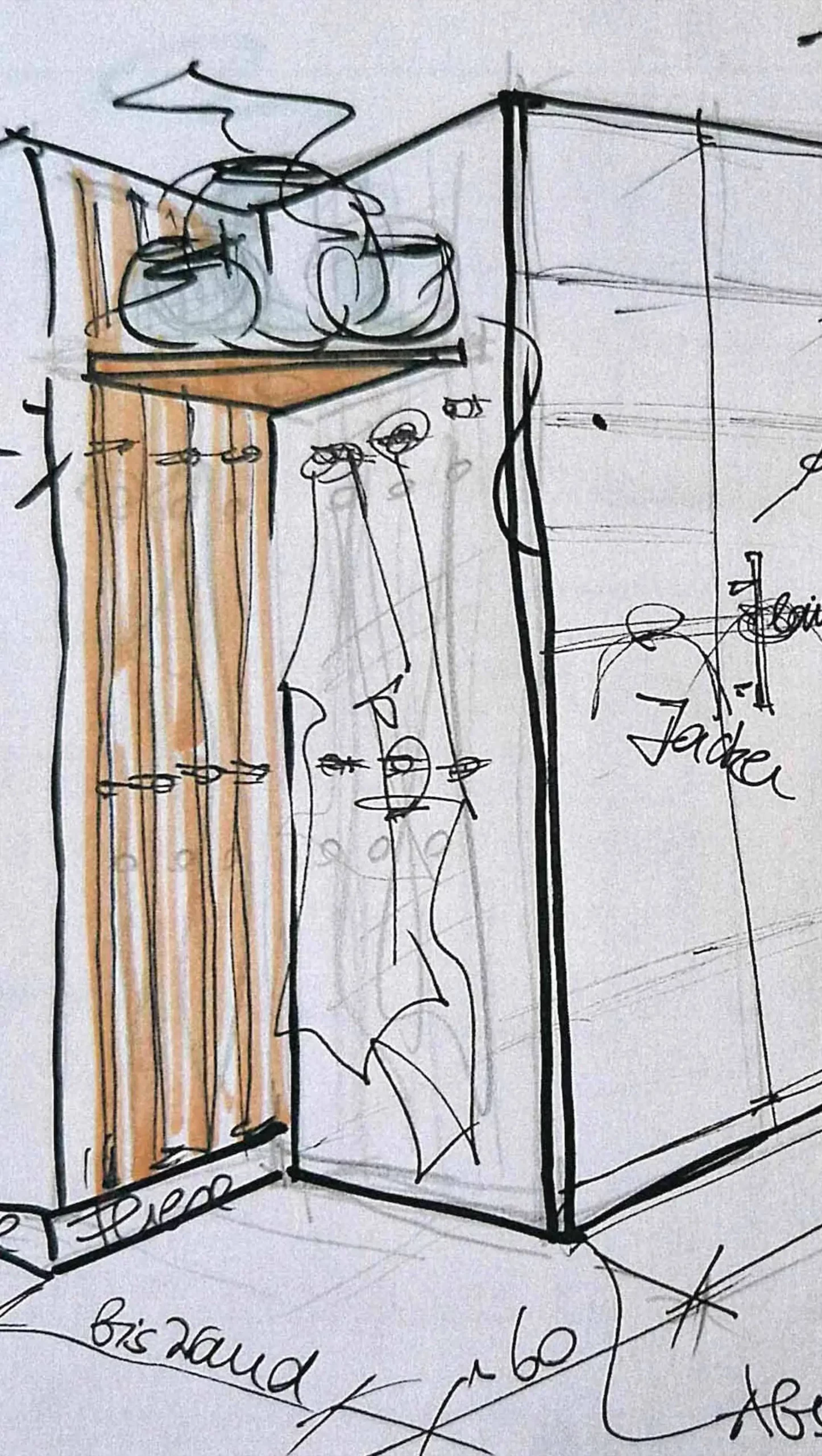 Wir erarbeiten erste Varianten zu den Themen Grundrissaufteilung, Möblierung, Materialien, Farbe und Licht zu den für Sie relevanten Bereichen. Sie erhalten erste Skizzen und Skribble.